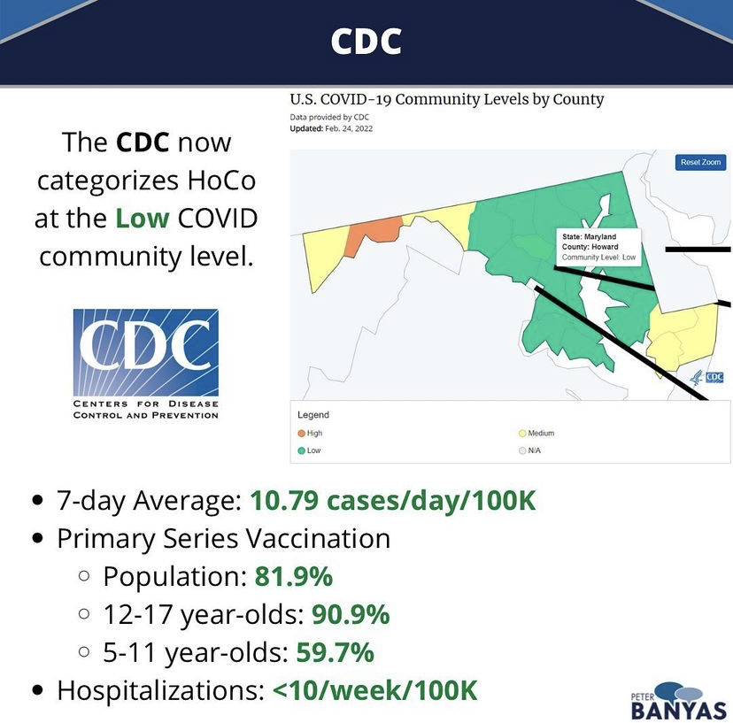 On February 1st, County Executive Calvin Ball released a statement with his reasoning for the lifted mask mandate in general Howard County spaces: “At the height of the post-holiday surge, our positivity rate was nearly 30%, our case rate per 100,000 was 199, and 84 people were hospitalized at Howard County General Hospital. During the past month, we’ve seen our metrics decrease significantly, and more of our residents got their vaccines and booster shots.”